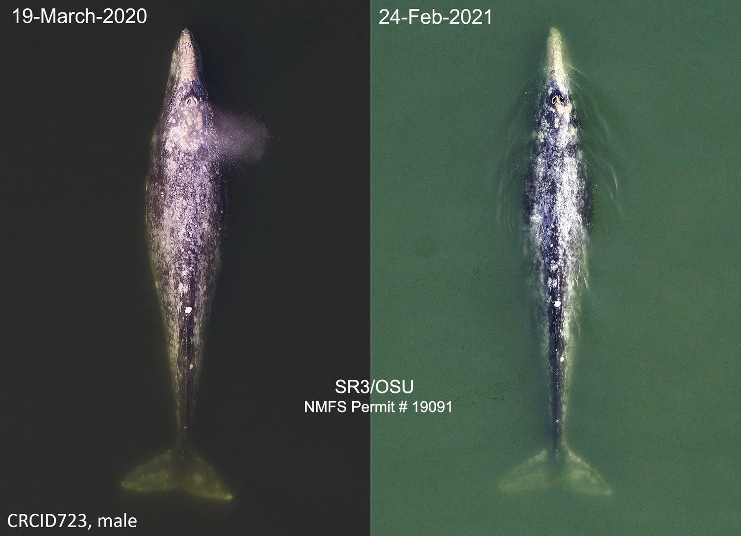 Aerial images of a “Sounder” gray whale (CRC-723, “Lucyfer”) taken on March 19th, 2020 and then again last week on February 24th, 2021. Note that Lucyfer appears more robust in the March 2020 image (left), likely the result of several extra weeks of foraging on ghost shrimp in Puget Sound. Images were collected non-invasively using a remotely-controlled drone flown at >150ft over the whales under NMFS research permit 19091. Photo by Holly Fearnbach (SR3) and John Durban (OSU).