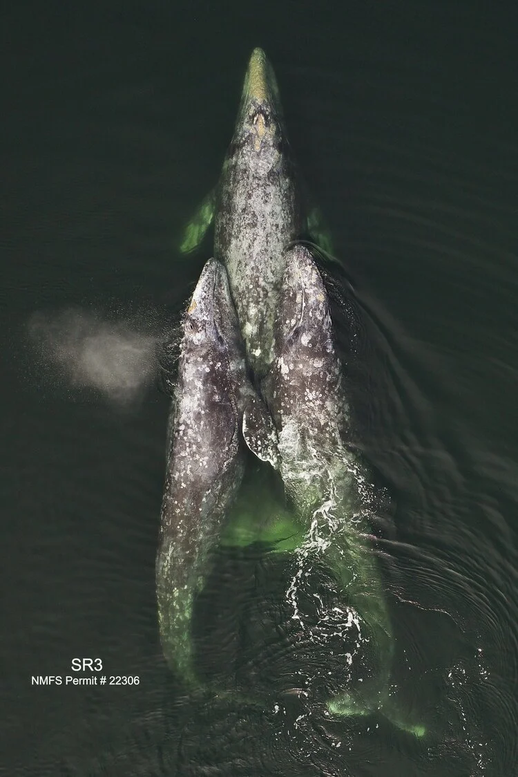 Aerial image of a social group of “Sounders” gray whale taken in April 2021. Image was collected non-invasively using a remotely-controlled drone flown at >150ft over the whales under NMFS research permit #22306. Photo by Holly Fearnbach (SR3) and John Durban (Oregon State University).