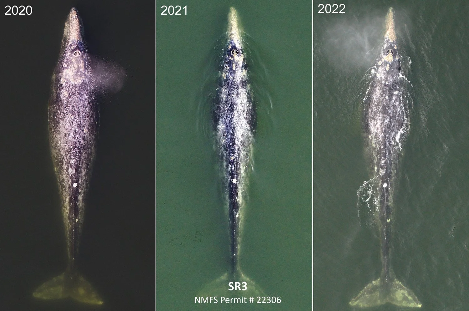 Aerial images of a “Sounder” gray whale (CRC-723, “Lucyfer”) taken in March 2020, February 2021 and then again in March 2022. Images were collected non-invasively using a remotely-controlled drone flown at >150ft over the whales under NMFS research permit 22306. Photo by Holly Fearnbach and John Durban.