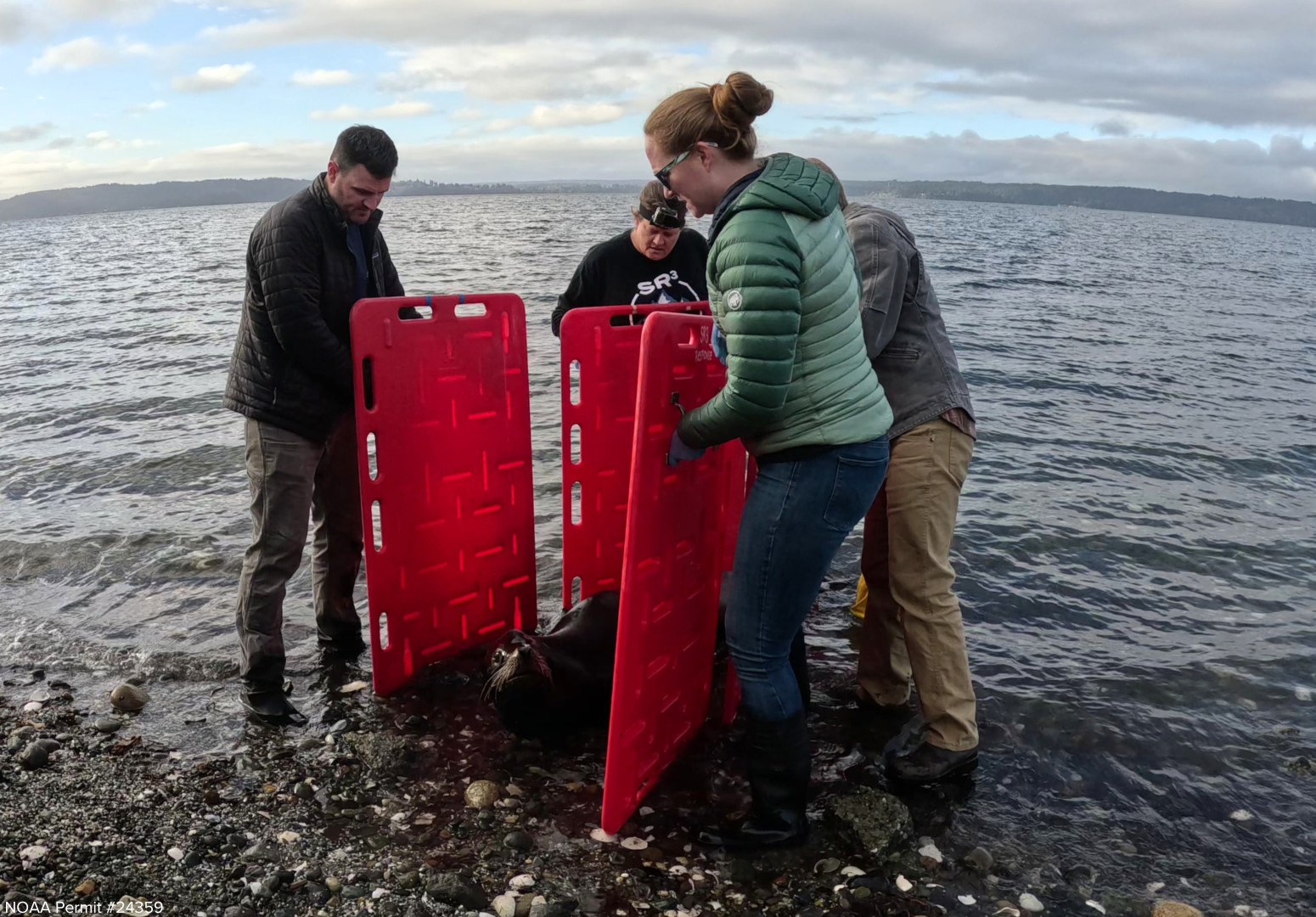 The Response Team guides the sea lion from the water line into a carrier.