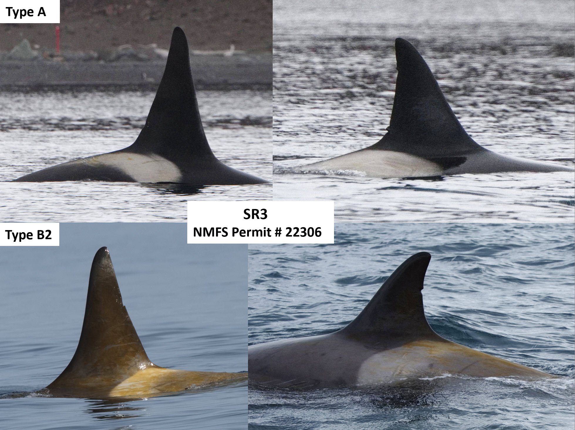 Photo-identification images of two individuals from a group of Type A killer whales encountered near Bransfield Strait (top row, first seen in 2014) and another two individuals from a group of Type B2 killer whales encountered in the Gerlache Strait (bottom row, first seen in 2012). These images will be used to identify individuals, estimate abundance using individual sighting histories, and monitor trends in abundance over time. Images were collected from a zodiac launched from the M/V National Geographic Explorer around the Antarctic Peninsula under NMFS Permit # 22306 and Antarctic Conservation Act Permits ACA 20220-010.