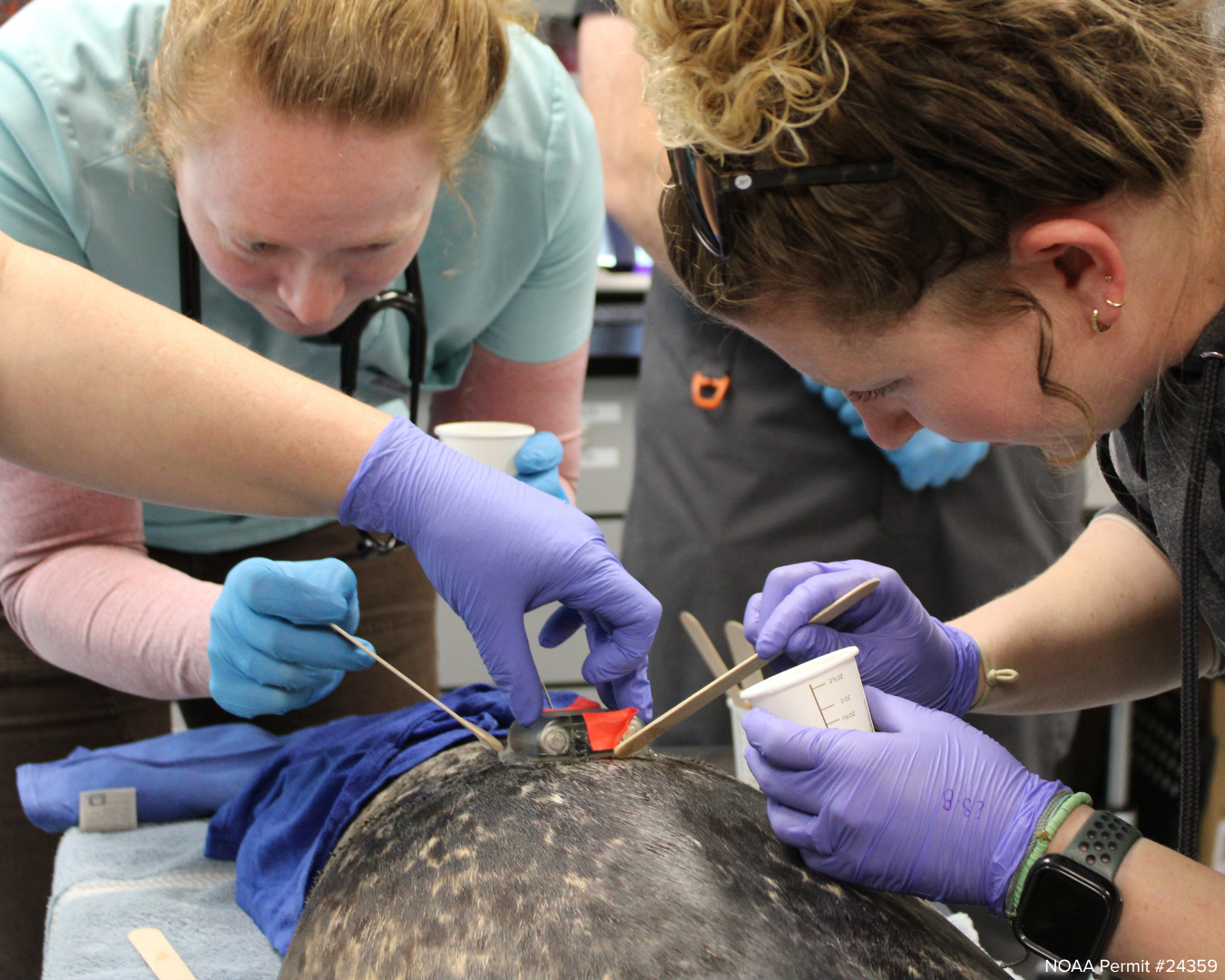 The animal care team applies Naga’s satellite tag to the fur on her back with glue. She is sedated during this procedure.