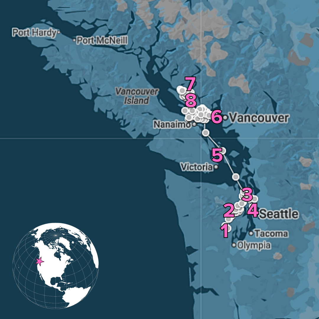 A map of Naga’s daily locations throughout the Salish Sea (marked with gray dots), with monumental parts of her journey labeled 1-8