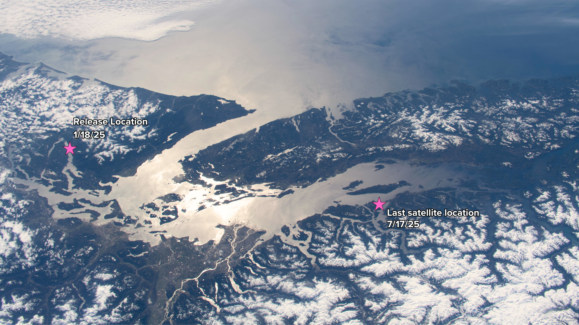 The Salish Sea from the International Space Station (NASA), marked with Naga’s release and last transmission locations.
