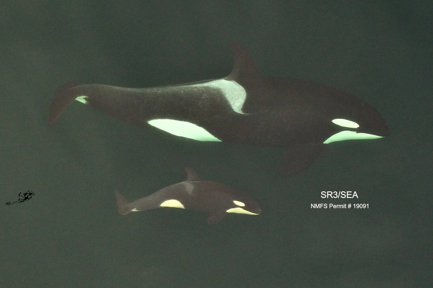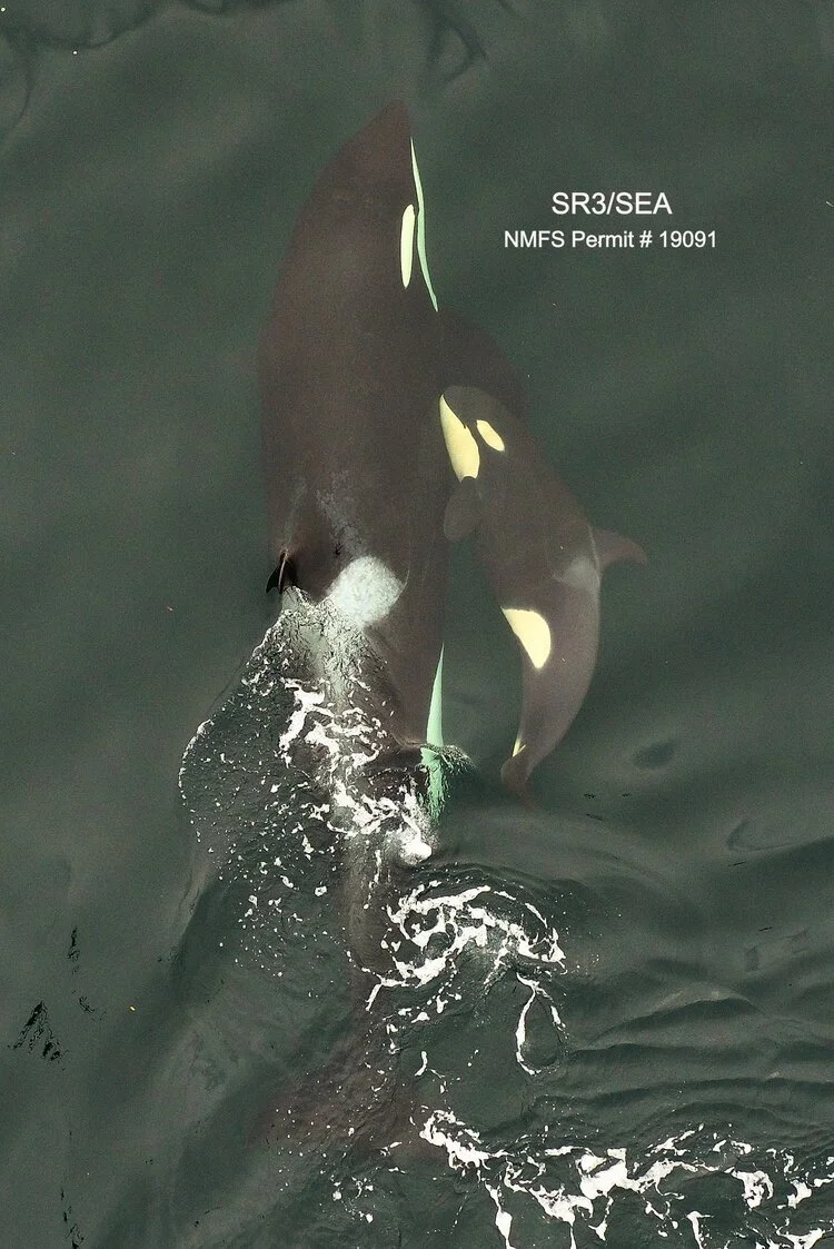 Aerial image of an adult female (J41) with her newborn calf (J58) from the endangered Southern Resident killer whale population. This image was collected in October 2020 using a remotely-piloted octocopter drone that was flown >100ft above the whales under NMFS Research Permit #19091.