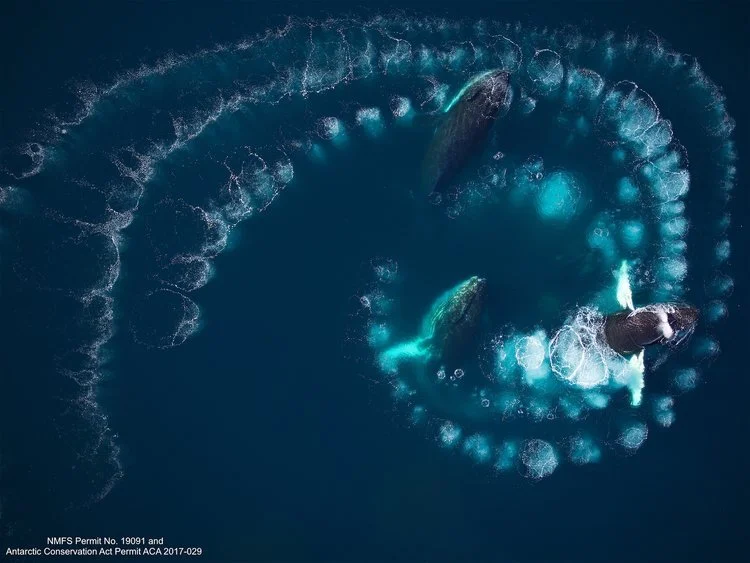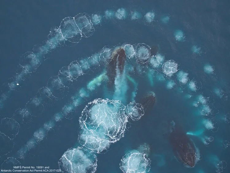 Aerial photographs of humpback whales creating a bubble net to corral krill in the coastal waters of the Antarctic Peninsula. These images were collected from >30m (100ft) above the whales using a small unmanned hexacopter. Research conducted under NMFS Permit No. 19091 and Antarctic Conservation Act Permit ACA 2017-029.