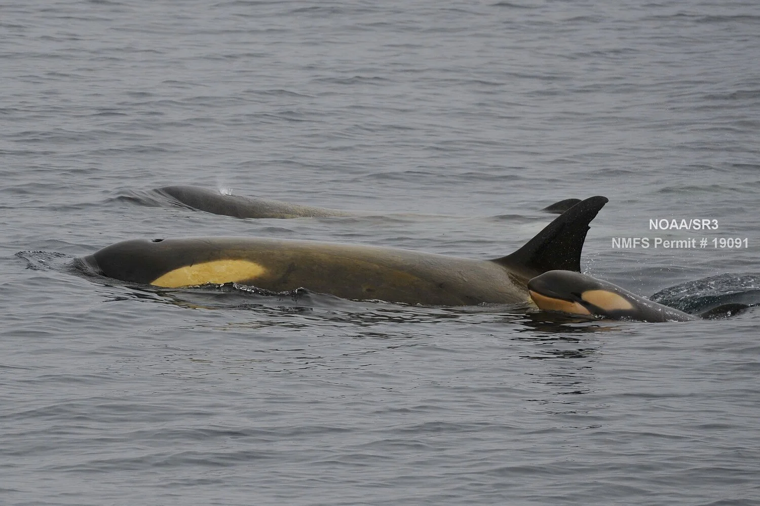 Photograph of an adult female Type B2 killer whale with her newborn calf in the coastal waters of the Antarctic Peninsula; note the yellow color due to accumulation of planktonic diatoms. This accumulation indicates that skin regeneration is not occurring in frigid Antarctic waters, requiring long-distance movements to warm tropical waters that are thermally advantageous. Photograph by Leigh Hickmott (SR3) collected under NMFS Research Permit 19091 and Antarctic Conservation Act Permit 2017-029.