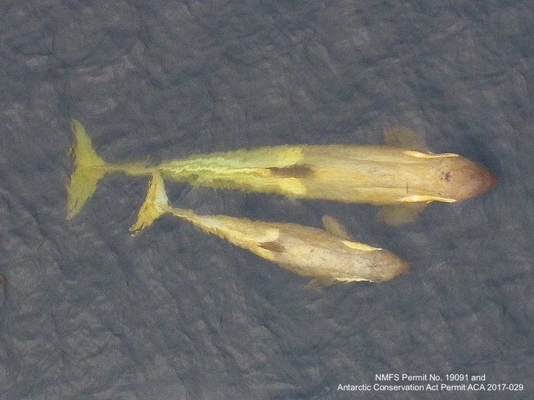 Aerial photographs of Type B2 killer whales in the Antarctic Peninsula showing: an emaciated adult female B2 killer whale with a dependent calf (left) and a newborn killer whale calf swimming between her mother and another family member (right). Note that the eye patches on the head of the emaciated whale (left) follow the shape of the skull due to fat loss behind the head. These images were collected from >30m (100ft) above the whales using a small unmanned hexacopter. Research conducted under NMFS Permit No. 19091 and Antarctic Conservation Act Permit ACA 2017-029.