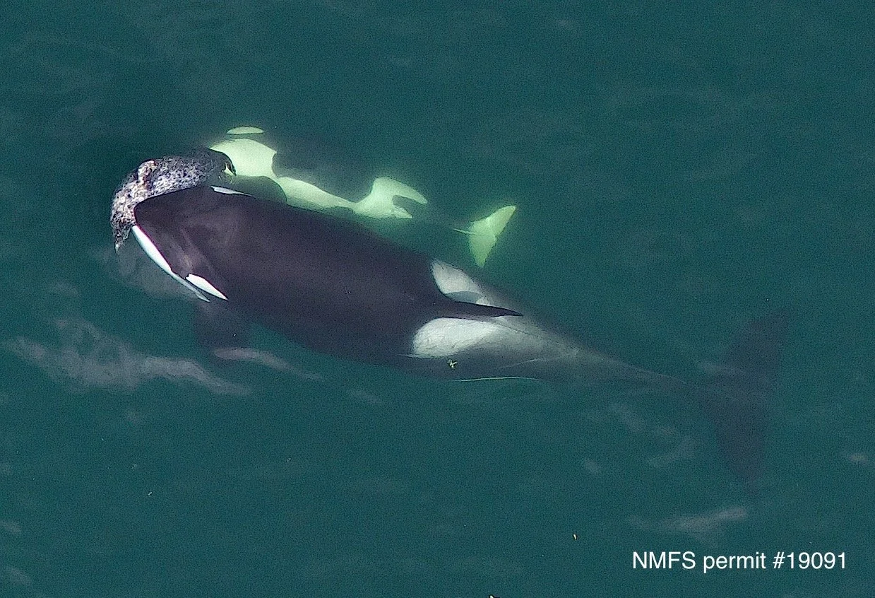 Aerial image showing a female Bigg’s (“transient”) killer whale and her 1 year old calf; note that the female is carrying a harbor seal in her mouth before killing it and sharing it. Images were obtained from an unmanned hexacopter that was flown >100ft above the whales under NMFS permit #19091.