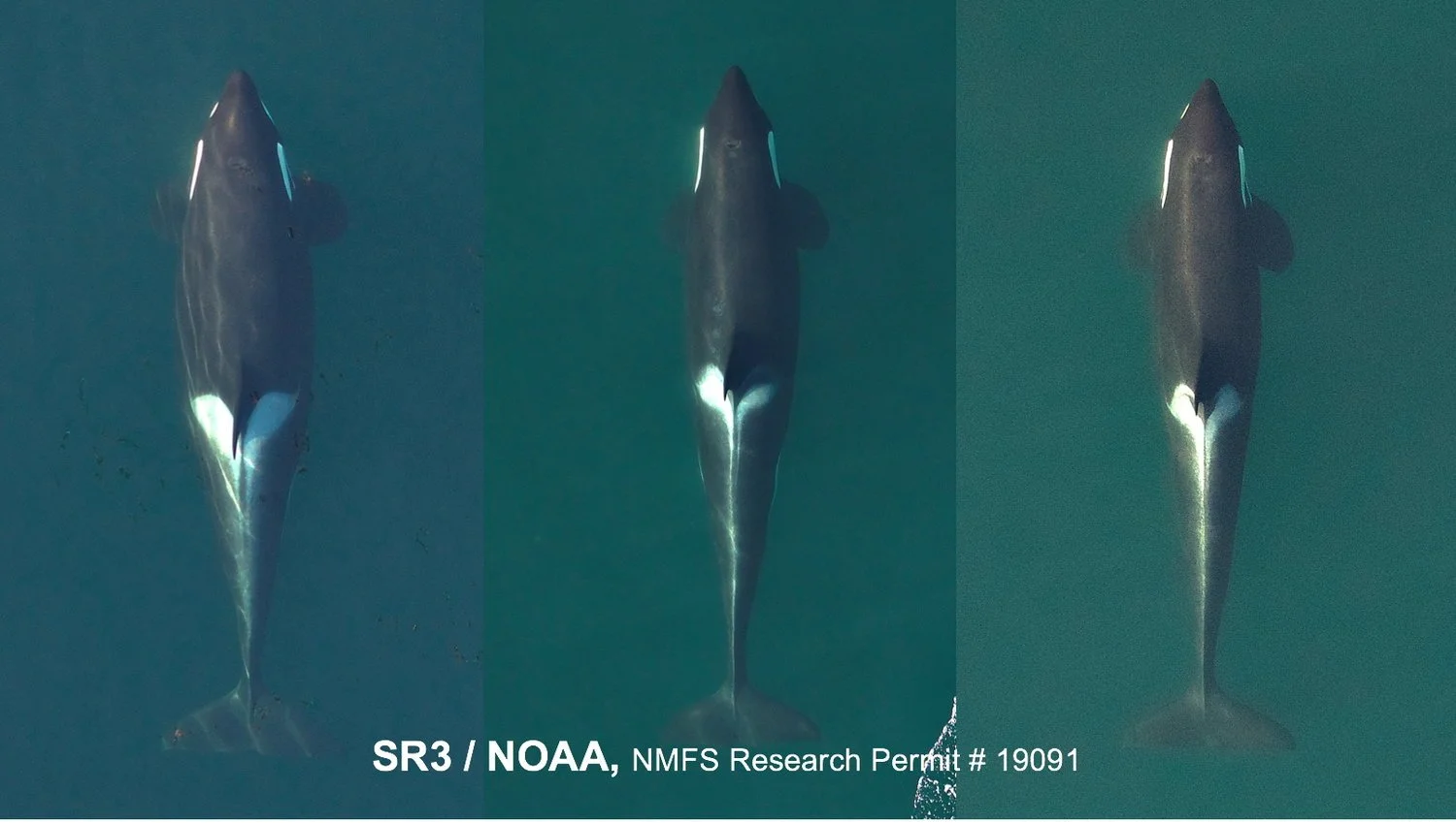 Aerial images of three adult females from J pod from September 2018 (J41, left, J16, center and J17, right). J41 is in robust condition and her width at mid-body indicates that she is pregnant, while J16 and J17 are in notably lean condition. Image by SR3 and NOAA Southwest Fisheries Science Center, obtained using an unmanned octocopter that was flown >100ft above the whales under NMFS permit #19091.