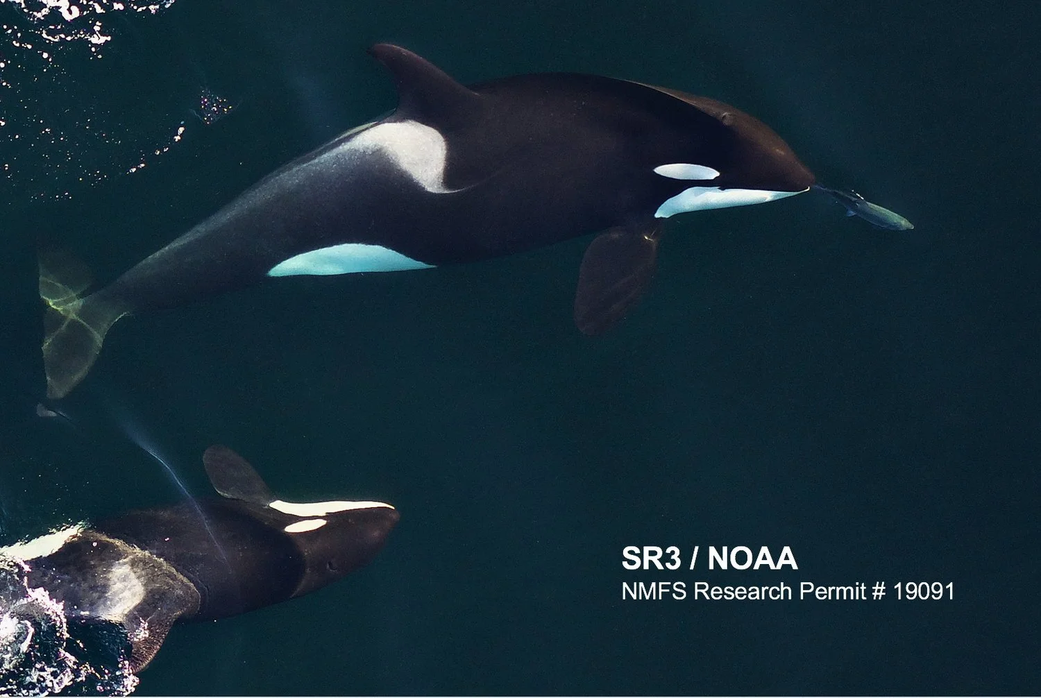 Aerial image of J41, a pregnant Southern Resident killer whale, successfully foraging alongside her juvenile offspring J51 in September 2018. Image by SR3 and NOAA Southwest Fisheries Science Center, obtained using an unmanned octocopter that was flown >100ft above the whales under NMFS permit #19091.