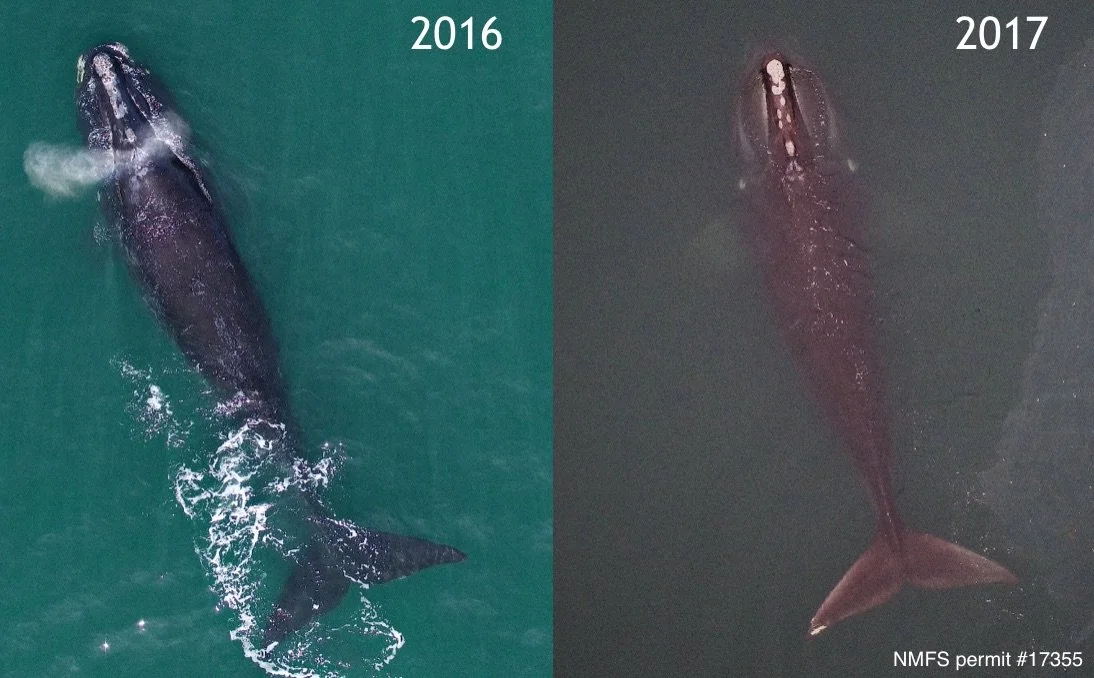 Two aerial photographs of the same adult female North Atlantic right whale, repeatedly imaged in Cape Cod Bay in March 2016 (left) and 2017 (right). Photogrammetry measurements will be used to assess changes in condition and monitor trends in growth over time. Images taken from an unmanned hexacopter >150ft above the whale, with research authorized by NMFS permit #17355.