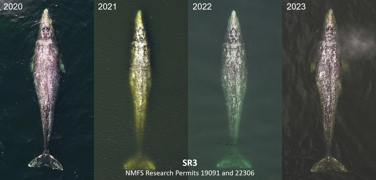 Aerial images of the same “Sounder” gray whale (CRC ID #21, “Shackleton”) in each of the past four years. Differences in body condition are quantified by measuring breadths along the profile of the whale, with the leanest profile documented in 2021. Images were collected non-invasively using an octocopter drone flown at >150ft over the whales under NMFS research permits 19091 and 22306.