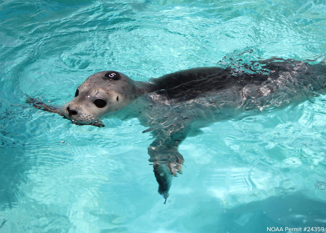 Once a pup’s teeth have grown in and they are medically stable, they are introduced to fish. This process, called Fish School, uses sustainably caught herring from Alaska. The fish is first tossed into a swim with them to see if they will eat it on their own. If they show no interest, then animal care staff use a pair of tongs to mimic the movement of fish through the water. If there is still no interest, then the fish is hand fed to the pup by placing it in their mouth. Pretty soon, the pup’s instincts kick in and animal care staff are able to progress back to tong feeding, which will ultimately lead to the pup foraging for fish on their own without the assistance of the animal care team. Fish school takes an average of two weeks, and formula is substituted throughout until the pup has a diet entirely of whole fish.