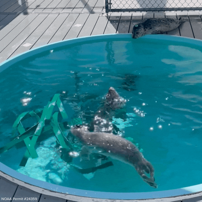 A pup graduates fish school when they eat fish on their own. At this point, a whole meal’s fish can be tossed into the pool with the pup and they can forage for their prey like they will in the wild. When multiple pups are at this stage, the fish is weighed out and combined for all patients in the pool and tossed in together so the seals practice competing for their food. We also have enrichment such as a “kelp forest” made of pipe and felt that can hide herring and helps the pups develop hunting skills. Their success is tracked through their weight gain, which is usually around 35 pounds over the two to three months they receive care at the Rescue Center.