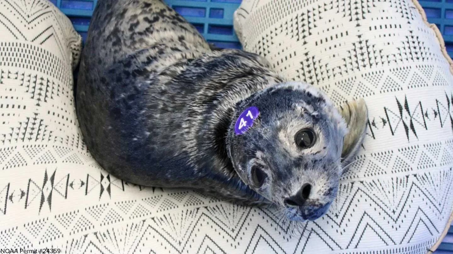 Naga the harbor seal pup rests on a pillow in her personal enclosure during the first week of her care.