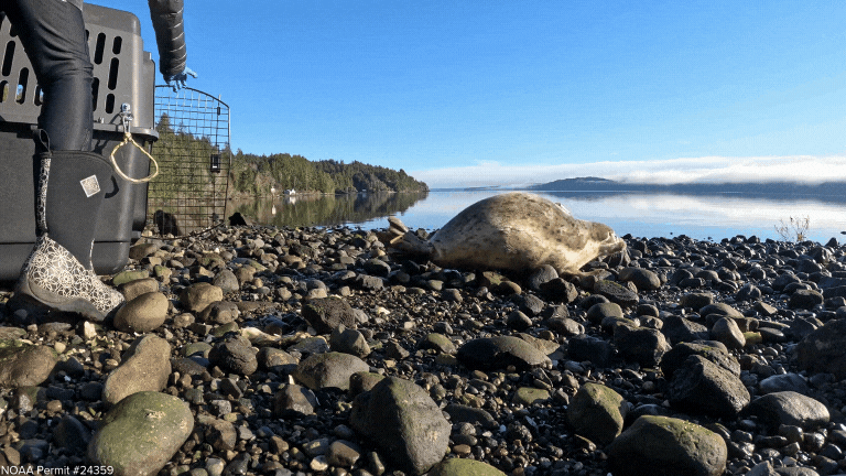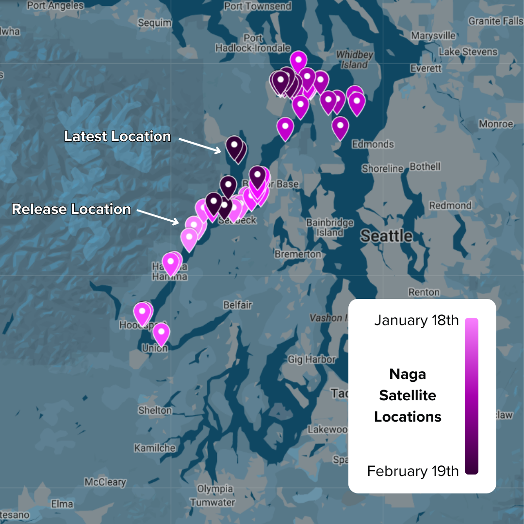 Naga was released with a satellite tracker glued to the fur on her back, so each time she floats at the surface of the water or rests on a shoreline, we receive information about her location. Since her release in mid-January, she has explored Hood Canal, Admiralty Inlet and central Puget Sound in Washington State. Stay tuned for more updates as we see where Naga goes from here!