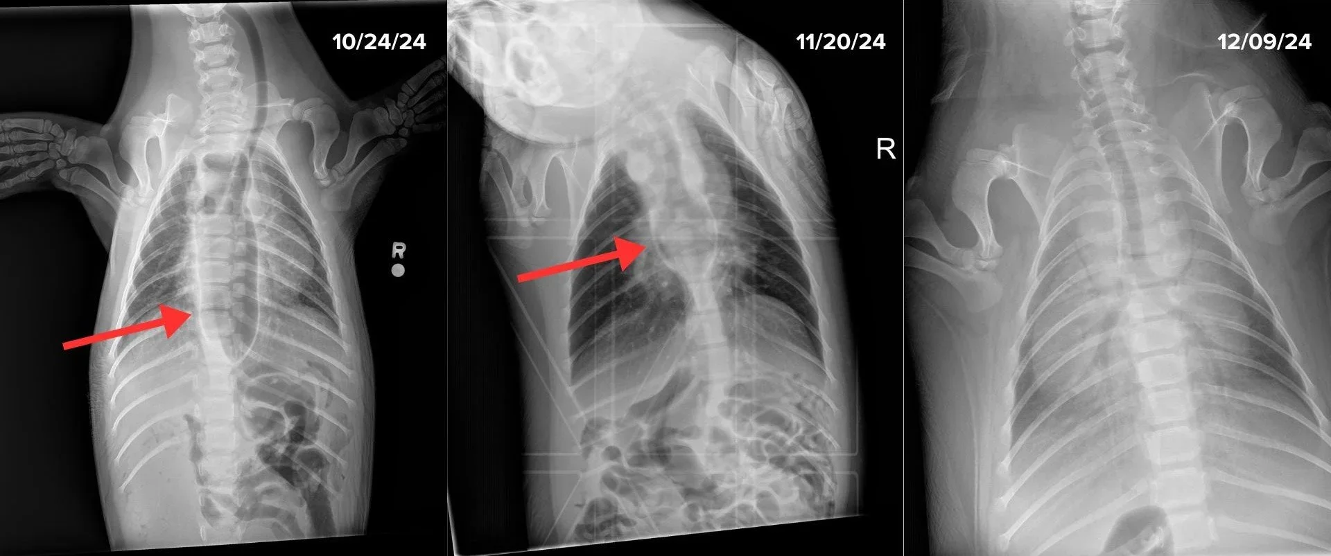 X-rays of Naga’s chest. A red arrow in the first two images points to her megaesophagus. It gets smaller in the middle image and her esophagus has returned to its normal size by the third.