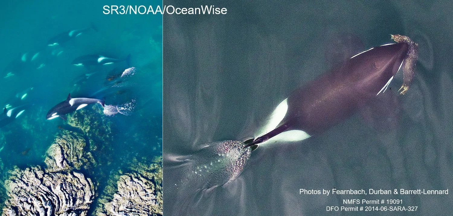 A new publication featuring SR3’s non-invasive photogrammetry research on killer whales was published this week in the scientific journal Marine Mammal Science (read the paper here). The paper is titled “Morphometrics of mammal‐eating killer whales from drone photogrammetry, with comparison to sympatric fish‐eating killer whales in the eastern North Pacific”. The study was based on drone images collected in the U.S. and Canada by SR3’s Holly Fearnbach and John Durban, working collaboratively with Lance Barrett-Lennard from Ocean Wise. Analysis by Chloe Kotik, a graduate student at the University of California San Diego, provided the first data on length, growth and body condition of free-swimming Bigg’s killer whales (BKWs), from the West Coast Transient population of mammal-eating killer whales. These measurements were compared to data that we have previously published on length, growth and body condition of endangered Southern Resident killer whales (SRKWs), which differ in their diet by their preference for fish, particularly Chinook salmon. Despite having overlapping ranges, these BKWs and SRKWs have been experiencing contrasting population trajectories, with SRKWs declining in abundance, while BKWs have been increasing in recent decades. This new study also found BKWs to be longer and in better body condition than SRKWs, which we suggest at least partially reflects responses to the more abundant prey available for BKWs (e.g. harbor seals, sea lions and porpoise), compared to the limited Chinook salmon available to SRKWs.