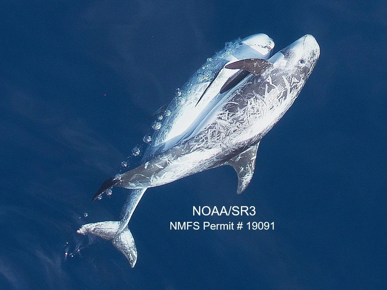 Aerial image of two Risso’s dolphins socializing off Santa Catalina Island, California. Image non-invasively collected using a multi-copter drone under NMFS Research Permit # 19091.
