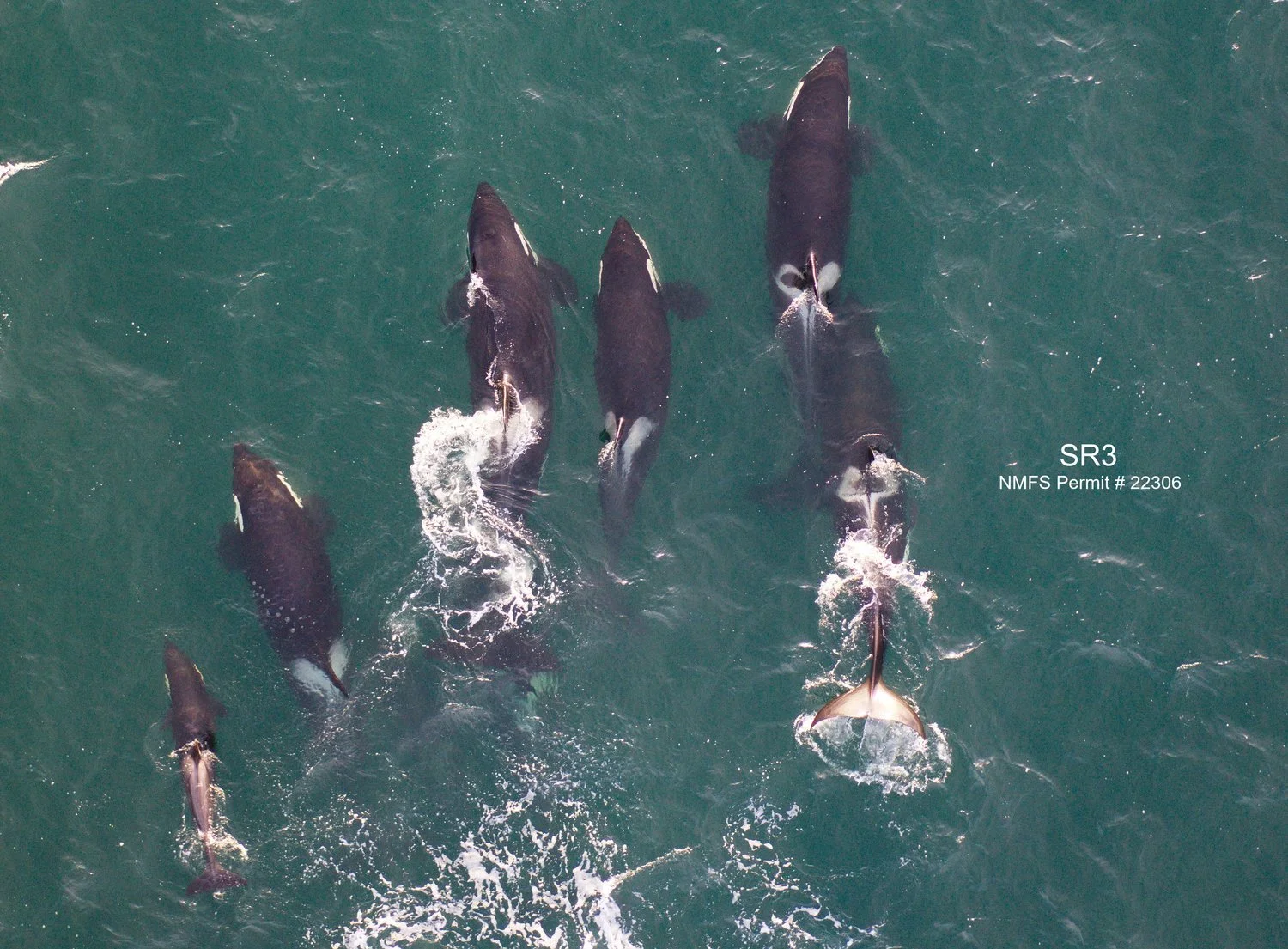 Aerial image of a group of L pod whales from the Southern Resident killer whale population. This group is being led by the population’s oldest member (L25, estimated to be over 90 years old), and also includes its youngest member (one year old, L125). This image was collected using a remotely controlled octocopter drone that was flown non-invasively >100ft above the whales in January 2022 under NMFS Research Permit # 22306.