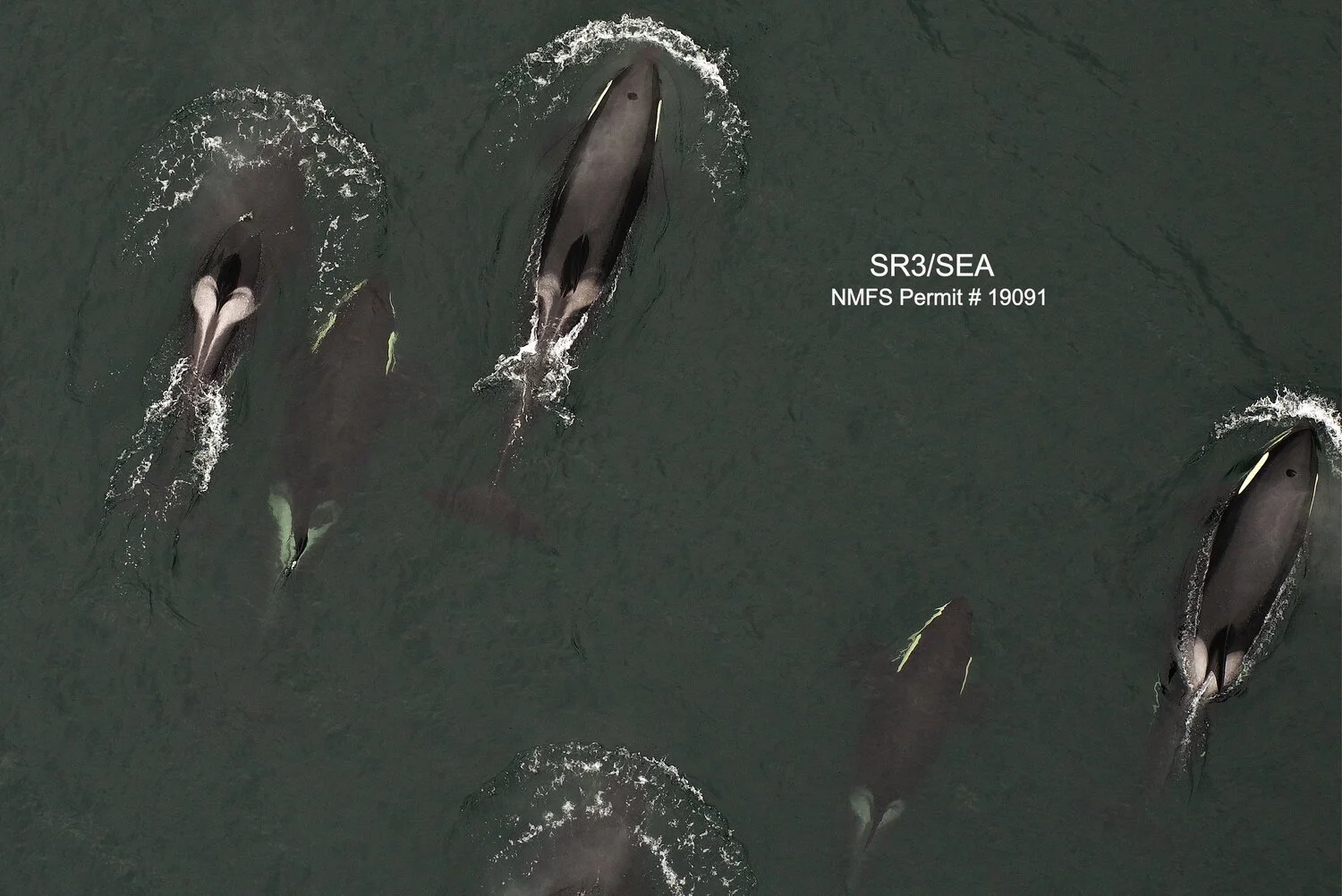 Aerial images of endangered Southern Resident killer whales collected in July 2020. The top image shows a group of K-pod whales and the bottom image shows J16 chasing (and later eating) a small salmon. These images will be used in photogrammetry analyses of growth and body condition. Images obtained using a remotely-piloted octocopter that was flown >100ft above the whales under NMFS Research Permit #19091.