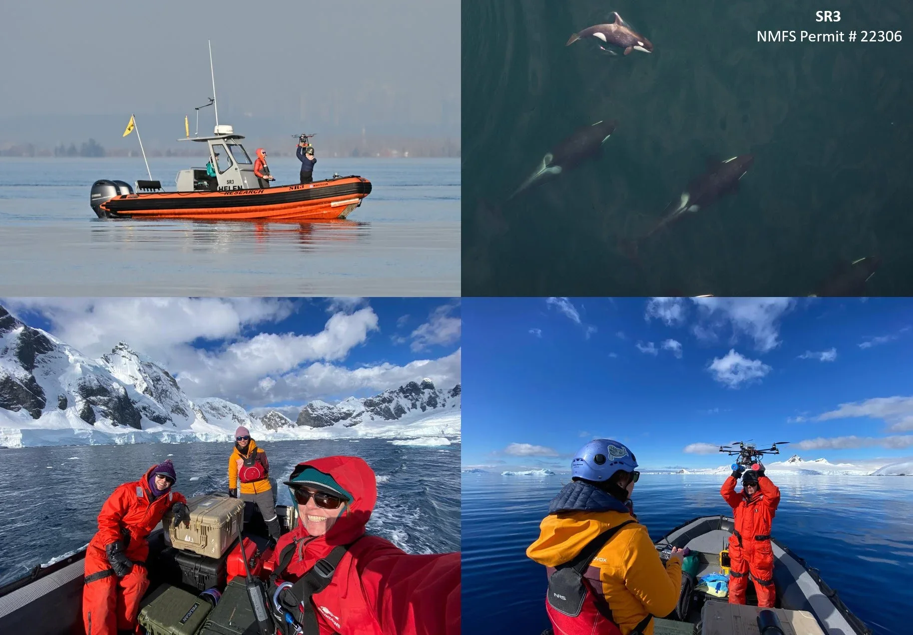 Top left: Photo of drone flight ops on SR3’s R/V Helen with Holly Fearnbach and Tess Chapman (SR3) and Jessica Farrer (The Whale Museum) during an encounter with Bigg’s transient killer whales in January 2025. Top right: Aerial image of members of L pod from the endangered population of Southern Resident killer whales in November 2024. Bottom left: Photo of Holly Fearnbach and Sadie Youngstrom (SR3) and Jessica Farrer (The Whale Museum) on a zodiac launched from the M/V National Geographic Explorer in the Antarctic Peninsula in February 2025. Bottom right: Jessica Farrer flying the drone out of the hands of Holly Fearnbach during an encounter with humpback whales in the Antarctic Peninsula in February 2025. Aerial images were collected non-invasively from > 100ft above the whales using a remotely-controlled hexacopter drone. Research conducted under NMFS Permit # 22306, DFO Research License XMMS 7 2023 and Antarctic Conservation Act Permit ACA 2017-029.