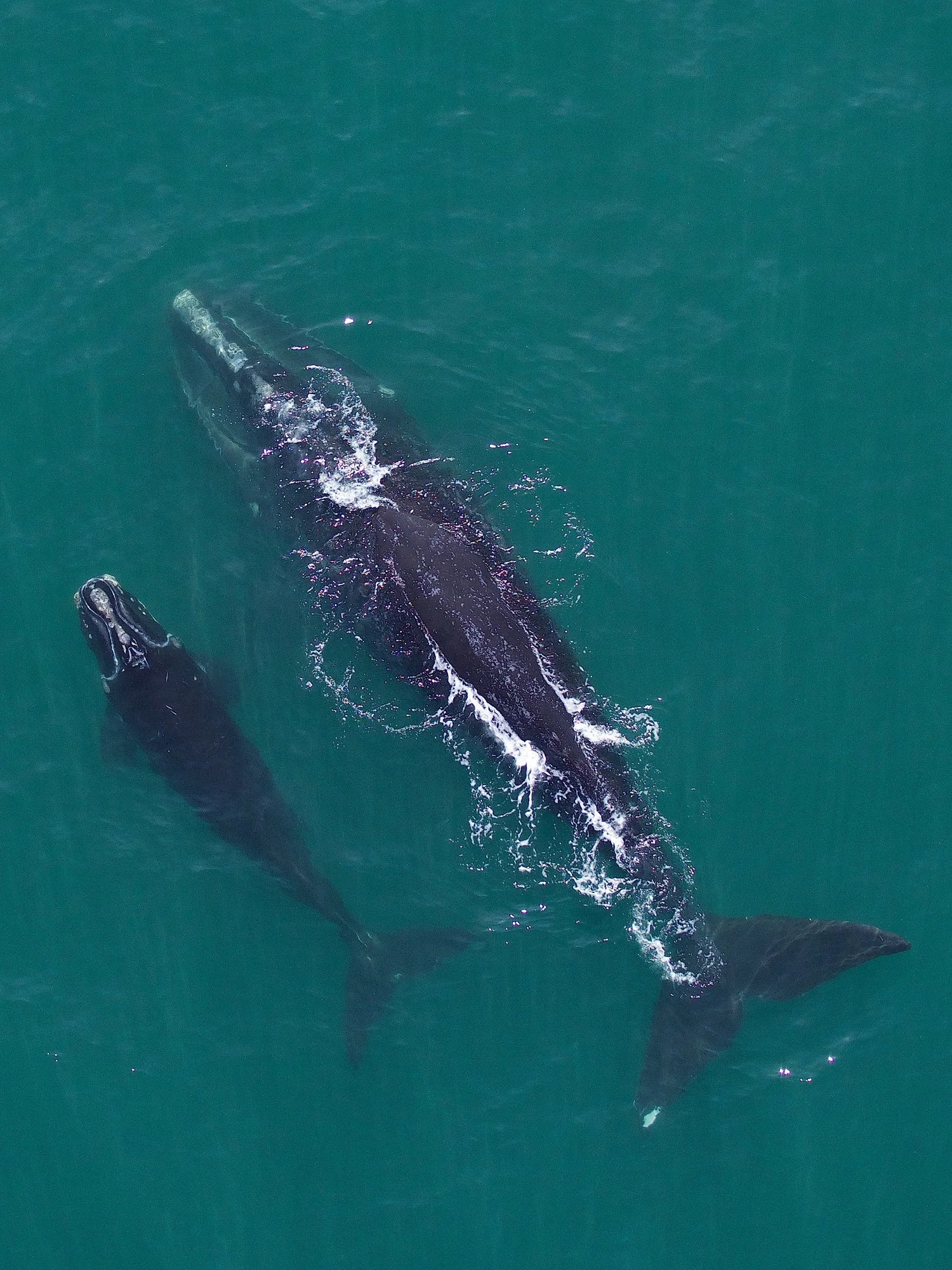 An adult North Atlantic right whale mother that brought her young calf from the calving grounds off the coast of Florida and Georgia to coastal waters of Cape Cod Bay in April 2016. Image taken with a drone at non-invasive altitude of at least 130ft above the whales, under NMFS research permit # 17355. Photo by John Durban and Holly Fearnbach, SR3.