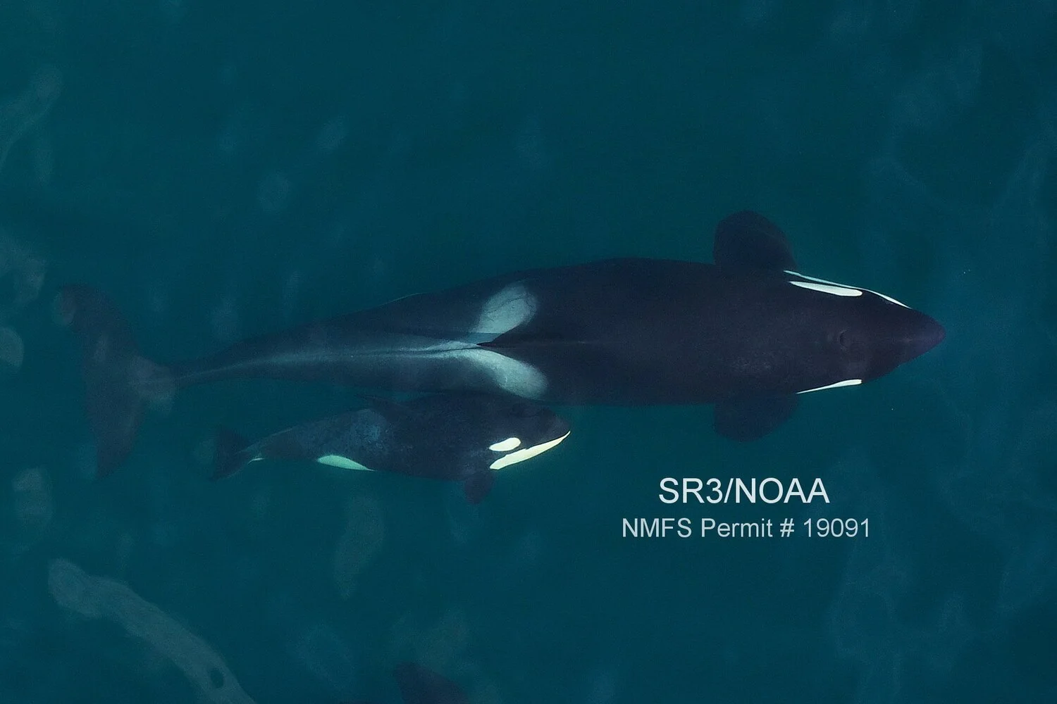 Aerial image of the J31 and her young calf J56 from the Southern Resident killer whale population. Image was collected by SR3 and NOAA’s Southwest Fisheries Science Center in September 2019 using an unmanned octocopter flown non-invasively >100ft above the whales under NMFS permit #19091.