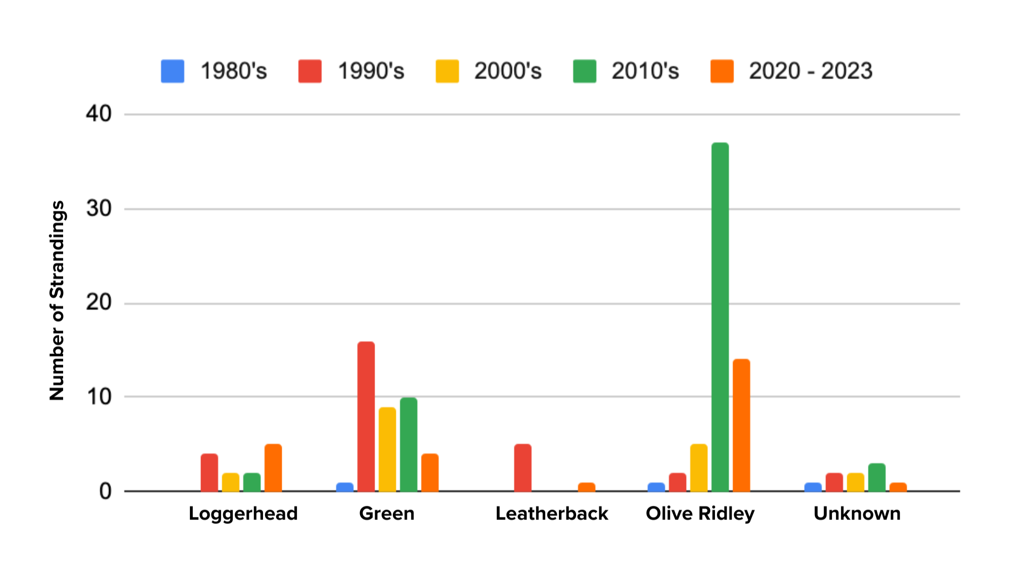 Sea turtle strandings by species and year. This data is from 1989 to Feb. 2023, and includes live and dead strandings in Washington, Oregon and California. Data from NOAA.