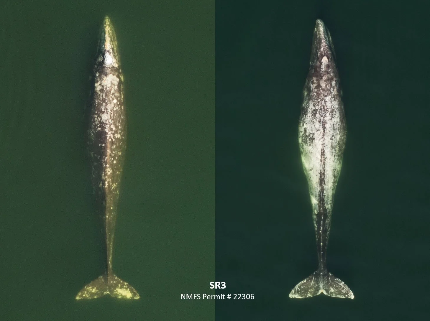 Aerial images of two “Sounder” gray whales photographed in March 2024. Note the differences in body condition of the two whales: the whale on the left is lean and the whale on the right is robust. Differences in body condition are quantified by measuring widths along the profile of the whale. Images were collected non-invasively using an octocopter drone flown at >150ft over the whales under NMFS research permits 22306.