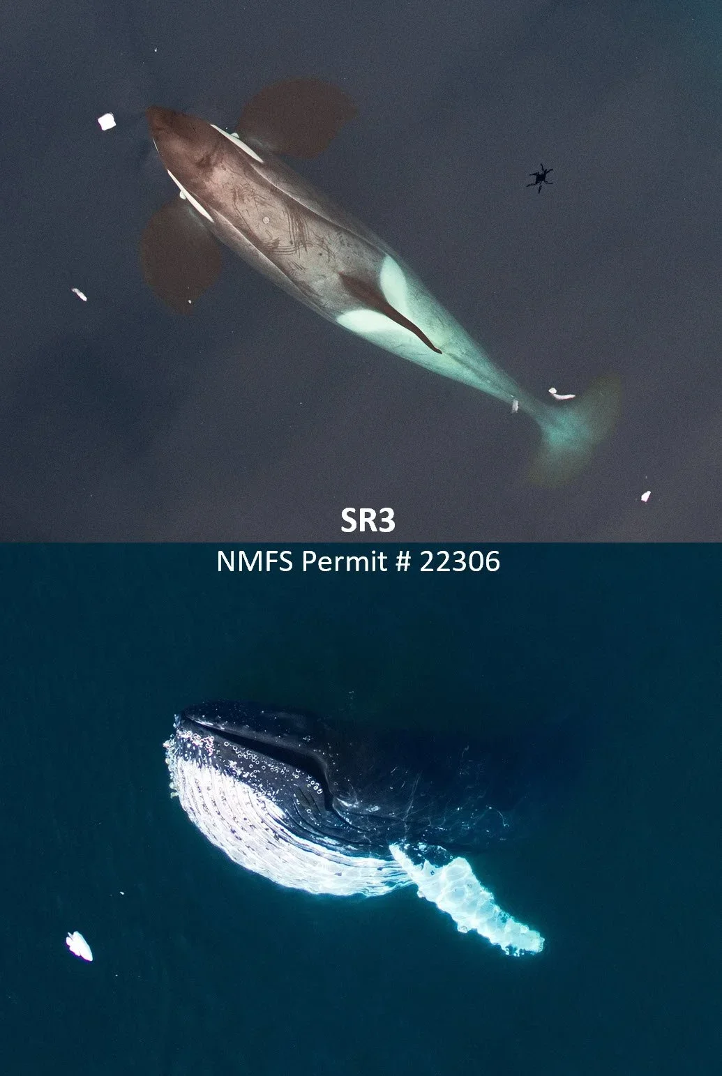 Aerial images of an adult male Type B1 killer whale (top) and a humpback whale feeding on krill after arriving on its Antarctic feeding grounds (bottom). Aerial images were collected non-invasively from > 100ft above the whales using remotely-controlled hexacopter drone. Research conducted under NMFS Permit # 22306 and Antarctic Conservation Act Permit ACA 2017-029.