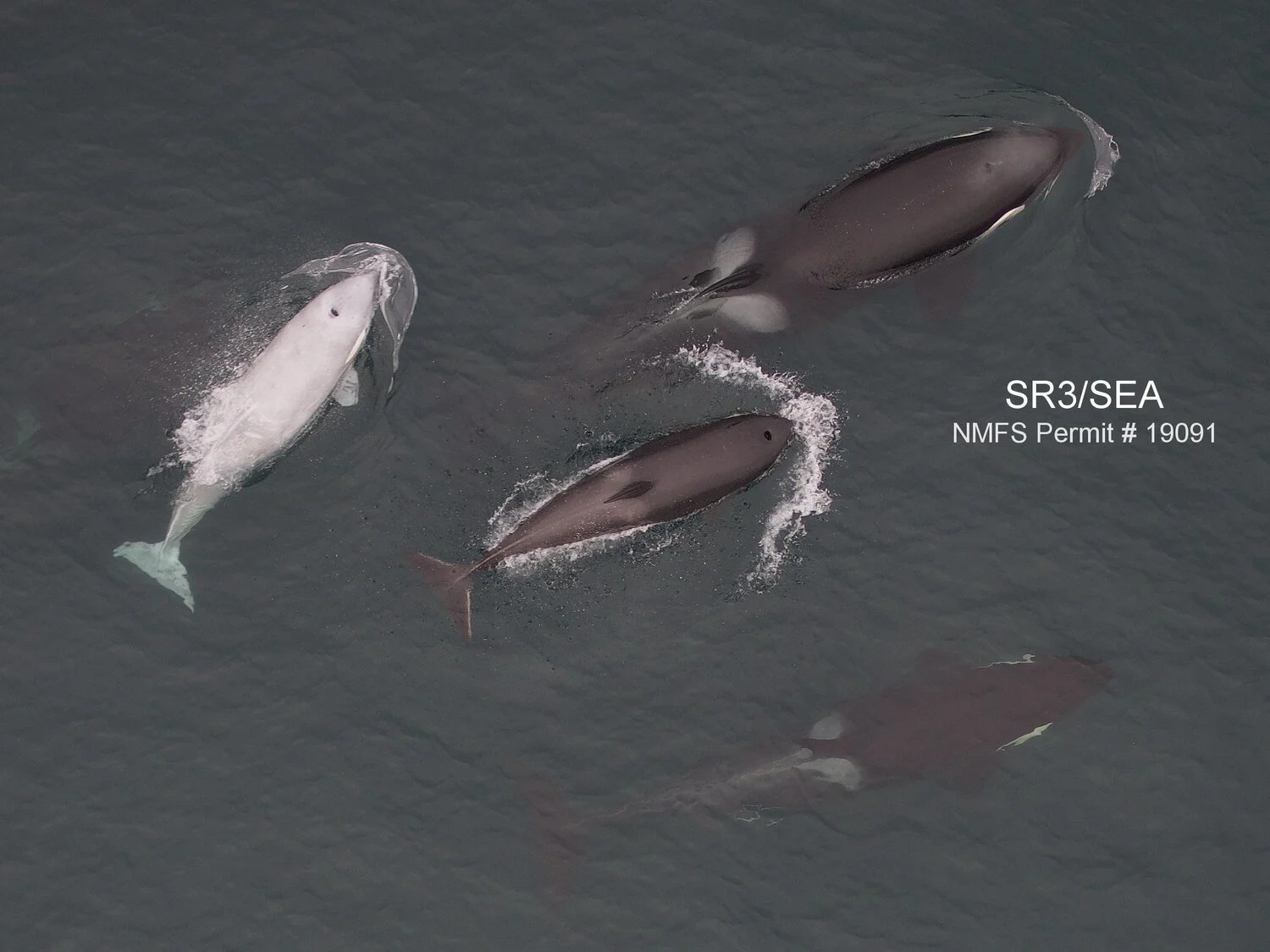 Aerial image of a group of Bigg’s Transient killer whales taken in December 2019. Note the young calf (T46B1B) on the left side of the image with anomalously pale coloration. Despite this condition, this whale appears to be in robust condition. Image obtained using an unmanned hexacopter that was flown non-invasively >100ft above the whales under NMFS permit #19091.