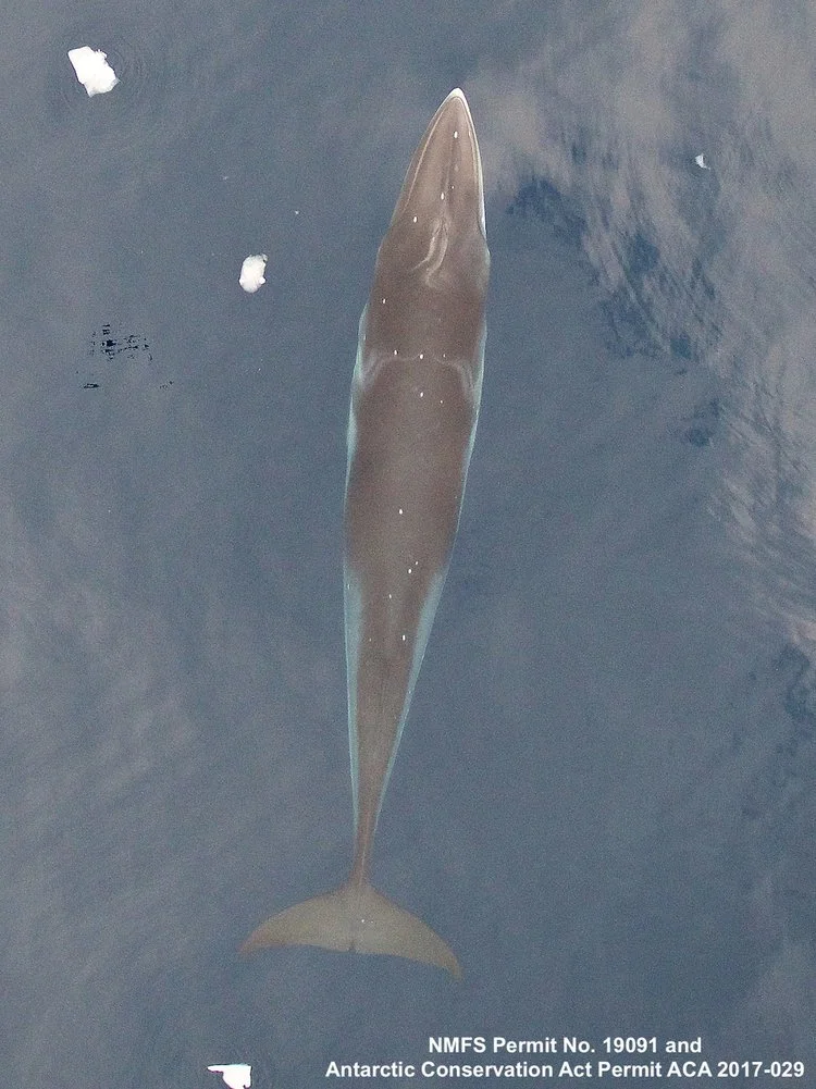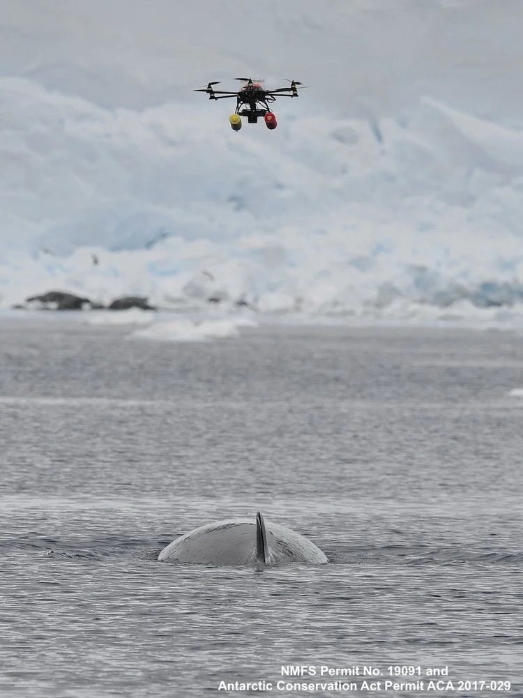Photograph of the hexacopter over an Antarctic minke whale during a blow sample collection and vertical photograph of an Antarctic minke whale. Blow will be analyzed to assess respiratory health and images will be measured to estimate size and assess body condition. Images were collected using a small unmanned hexacopter. Research conducted under NMFS Permit No. 19091 and Antarctic Conservation Act Permit ACA 2017-029.