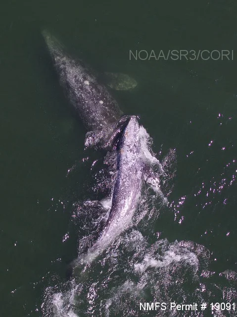 Aerial image of an adult female and playful juvenile gray whale taken off Everett in northern Puget Sound, Washington State, using an unmanned octocopter that was flown >125ft above the whales, under NMFS permit #19091.