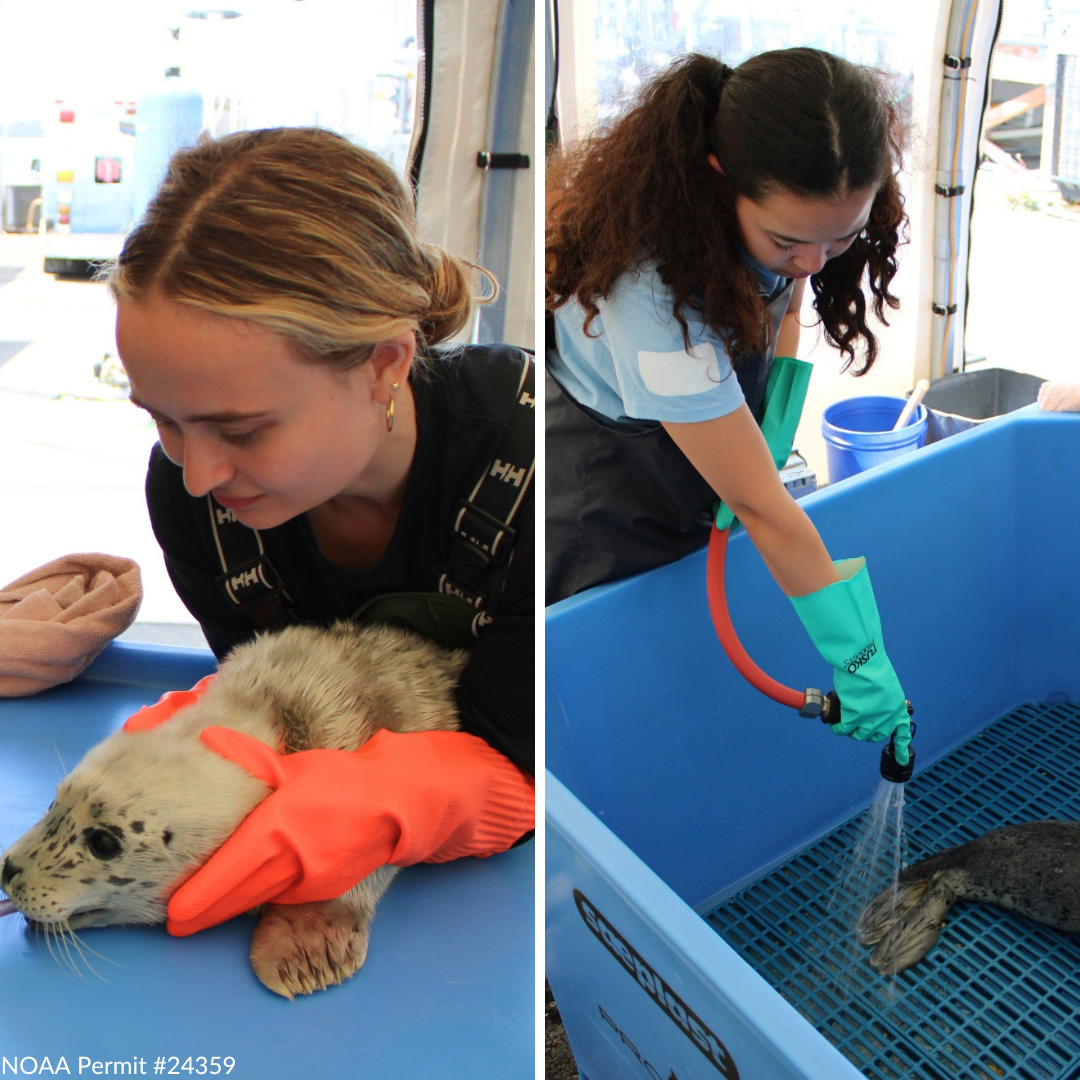 SR3’s Response Coordinator KC, along with the Marine Science and Technology Center's Community Engagement Coordinator Aeriel, assess a harbor seal pup who was rescued off the beach. |