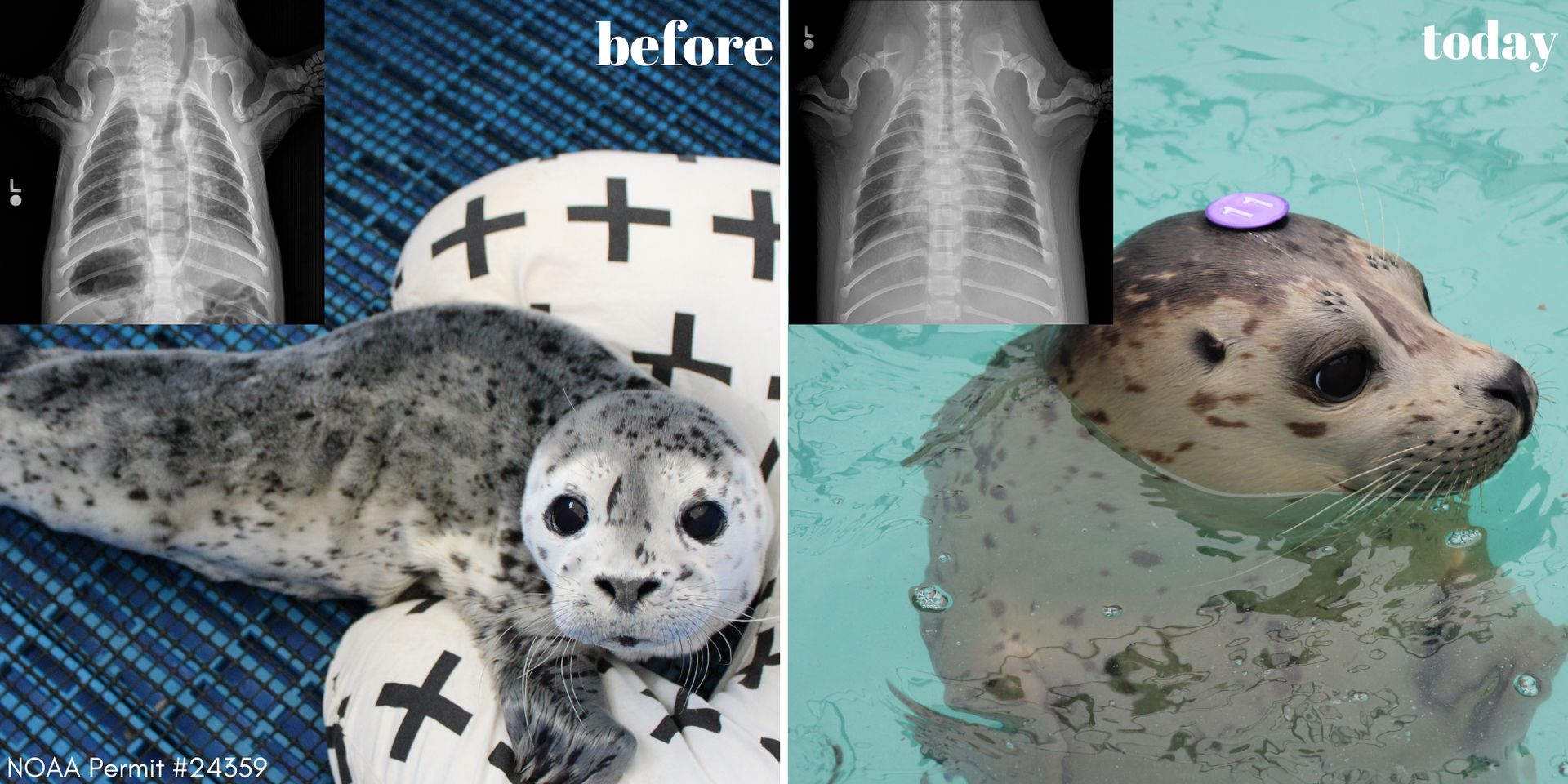 Before and after images of Linguine: while one of the biggest differences you can see in her x-rays is the thickness of her blubber layer, these images also reveal an even more remarkable recovery - the resolution of megaesophagus - a condition historically considered a death sentence for seals.
